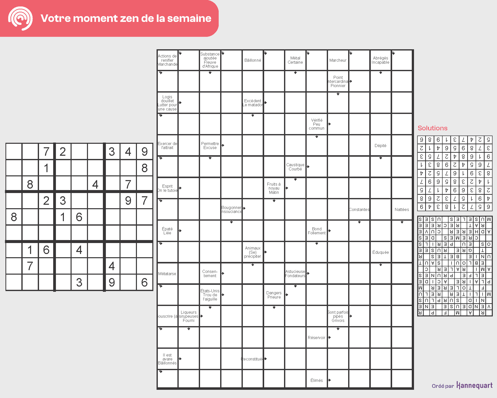 Duo Sudoku et Mots-fléchés | 13 octobre 2025Téléchargez une version PDF Découvrez le plaisir et l’épanouissement de ces sudokus et mots-fléchés stimulants de Hannequart.