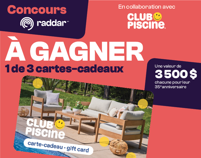 Limite : Une (1) participation par personne, par adresse courriel valide, par jour. Pour être admissible au tirage, vous devez être inscrit, ou vous inscrire, à l’infolettre de raddar au moment de soumettre votre participation.