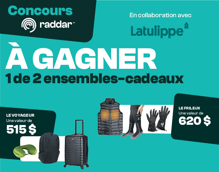Pour être admissible, vous devez être abonné à l’infolettre raddarMD au moment de soumettre votre bulletin de participation. Limite d’une (1) inscription par personne, par jour, par adresse courriel. Le concours est ouvert à tous les résidents du Québec.