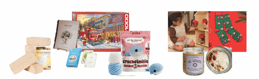 Dans le salon, les plus grands enfants s’appliquent sur un casse-tête Eurographics, pendant que d’autres éclatent de rire autour de GIGI le jeu qui rit, plaisirs d’hiver de Jeux Face 4. Un peu plus loin, les plus petits inventent des histoires avec leurs figurines Flek, les pieds bien au chaud dans leurs bas Sokette. Près du poêle, la grand-maman tricote un kit Crochetmilie, tandis que le feu des bûches Mirabûches crépite doucement. Un parent griffonne les rires et les petits instants dans un carnet de L’Assembleuse, pendant qu’un autre allume la bougie de Noël Menthe-Poivrée La Fée Rêve.